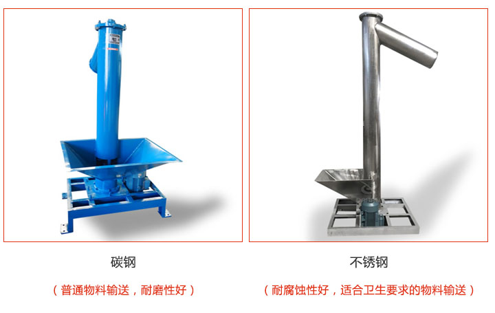 垂直螺旋輸送機(jī)材質(zhì)有碳鋼和不銹鋼兩類(lèi),碳鋼適合普通物料輸送,耐磨性好;不銹鋼適合醫(yī)藥,食品,化工行業(yè)的大豆,藥品,化工粉末等物料的輸送,耐腐蝕性好,不易生銹,干凈衛(wèi)生;不銹鋼價(jià)格比碳鋼高出500-3000元左右。