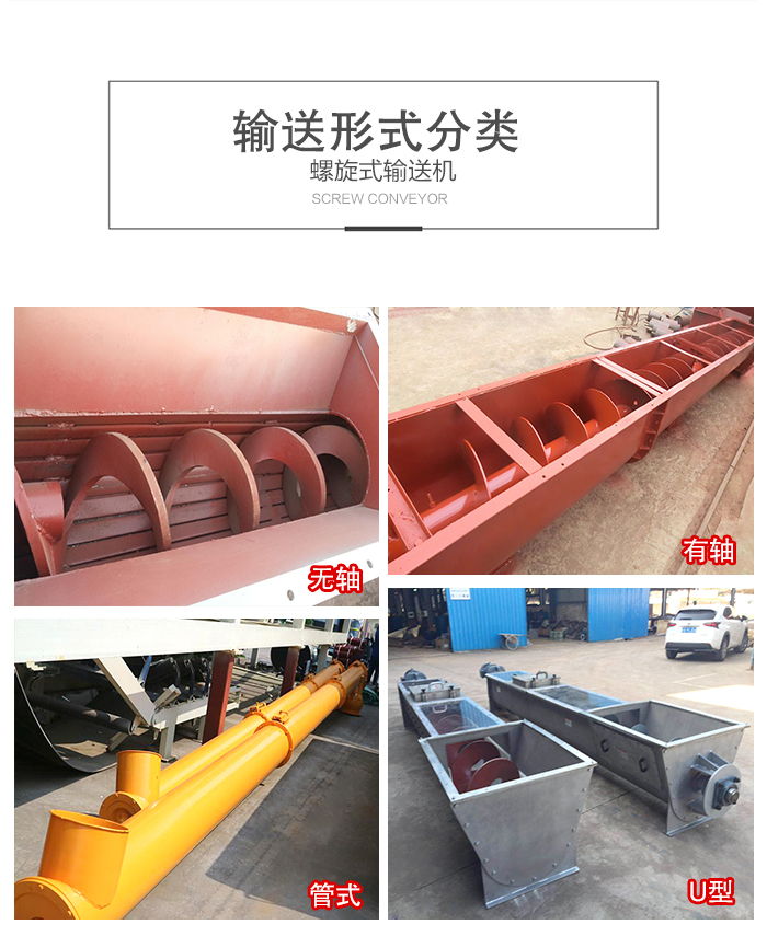 螺旋式輸送機(jī)在輸送形式上分為有軸螺旋式輸送機(jī)和無軸螺旋式輸送機(jī)兩種,在外型上分為U型螺旋式輸送機(jī)和管式螺旋式輸送機(jī)。