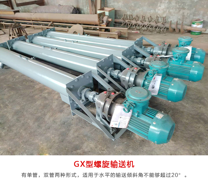 GX型螺旋輸送機(jī)有單管,雙管兩種形式,適用于水平的輸送傾斜角不能夠超過(guò)20°??奢斔鸵恍K狀的(小塊狀物料)例如:麥子,玉米,黃豆等糧食。