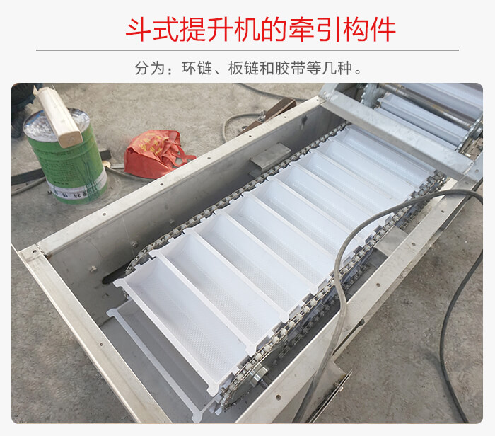 環(huán)鏈的結(jié)構(gòu)和制造比較簡單,與料斗的連接也很牢固,輸送磨琢性大的物料時(shí),鏈條的磨損較小,但其自重較大。板鏈結(jié)構(gòu)比較牢固,自重較輕,適用于提升量大的提升機(jī),但鉸接接頭易被磨損,膠帶的結(jié)構(gòu)比較簡單,但不適宜輸送磨琢性大的物料,普通膠帶物料溫度不超過60°C,夾鋼繩膠帶允許物料溫度達(dá)80°C,耐熱膠帶允許物料溫度達(dá)120°C,環(huán)鏈、板鏈輸送物料的溫度可達(dá)250°C。